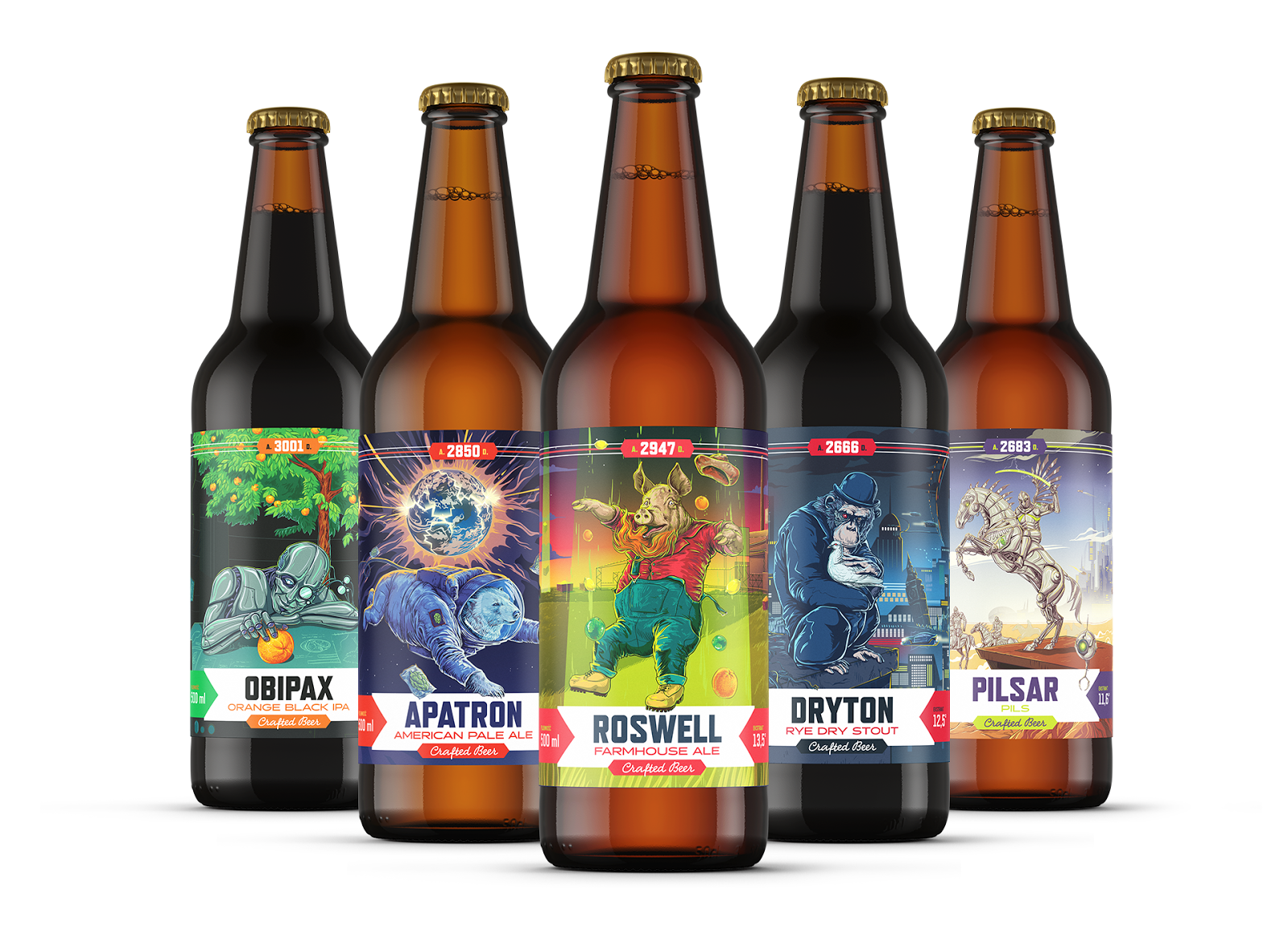 Probus Brewery is a Polish brewery with a strong historical background, located in Lower Silesia. When they decided to start to brew craft beer, using new wave styles, they asked us for help. We created whole concept of label series, dedicated to craft beer lovers. Labels present fictional events and heroes from the future, show our vision of the world without “human and nature”. The second series of beer is based on traditional beer styles and the real, historical labels. But that is another story …